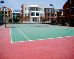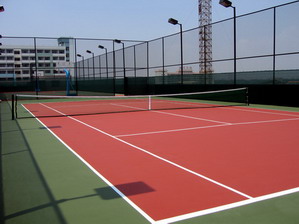 這是一種現(xiàn)場澆鋪用刮板制作在瀝青混凝土上或鋼盤混凝土結(jié)構(gòu)地面上的新型材,其工藝主要分為找平結(jié)合層、加強(qiáng)層、耐磨層等多層做法,還有含膠粒的多層做法這種面層材料及工藝的優(yōu)點(diǎn)是平整度高、表面硬度高、耐磨、抗曬、色澤鮮艷、使用壽命長便于管理和維修。這種面層材質(zhì)穩(wěn)定的網(wǎng)球場近年來已開始在世界各地普遍采用,管它球速稍快,較之其它類型球場,球的彈跳平衡,球員場上跑動(dòng)舒服,是一種既可供娛樂打球也可用做正規(guī)比賽的高檔次網(wǎng)球場地