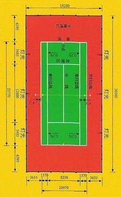國際網(wǎng)聯(lián)和國家體委頒布的《網(wǎng)球競賽規(guī)則》中規(guī)定,一片標(biāo)準(zhǔn)網(wǎng)球場地的占地面積不小于36.58米(長)×18.29米(寬),這個(gè)尺寸也是一片標(biāo)準(zhǔn)網(wǎng)球場地四周圍擋網(wǎng)或室內(nèi)建筑內(nèi)墻面的凈尺寸。在這個(gè)面積內(nèi),有效雙打場地的標(biāo)準(zhǔn)尺寸是:23.77米(長)×10.97米(寬),在每條端線后應(yīng)留有不小于3.66米的空地。在球場安裝網(wǎng)柱,兩柱中心測(cè)量,柱間距離是12.80米。網(wǎng)柱頂端距地平面是1.07米,球網(wǎng)中心上沿距地平面是0.914米。